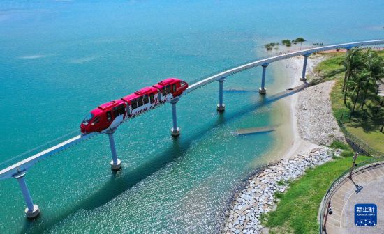 10月19日,海上小火车在海南海洋欢乐世界度假区行驶(无人机照片)。